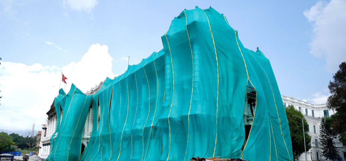 Burned Singha Durbar covered with tarpaulin as repairs begin
