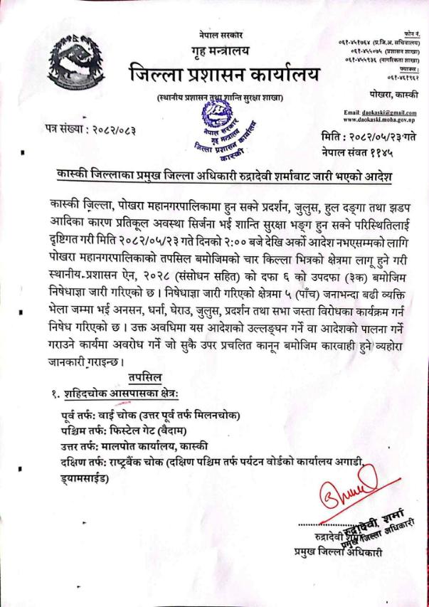 Issuing a notice on Monday, the District Administration Office, Kaski, said the curfew was enforced from 2 pm today and will remain in place until further notice.