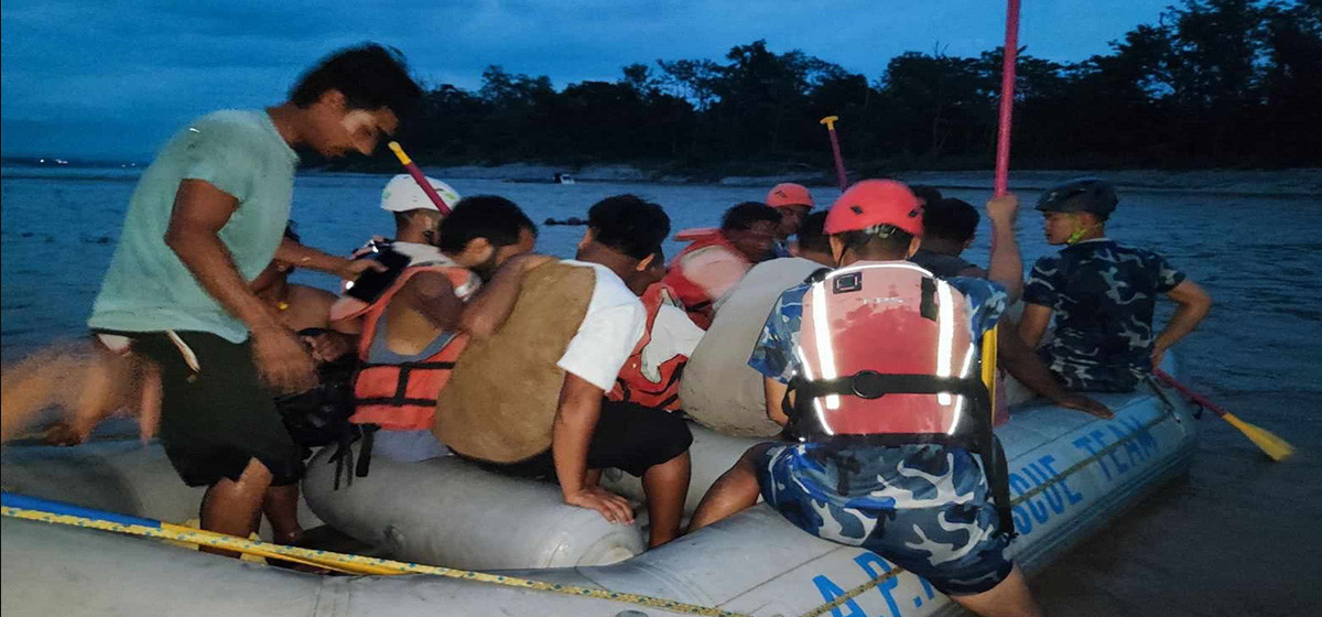 After receiving the information, the Armed Police Force Nepal, 17th Battalion Chitwan, led by Armed Police Inspector Chamanarayan Mahto, deployed a security team with divers who rescued the stranded individuals using a boat.