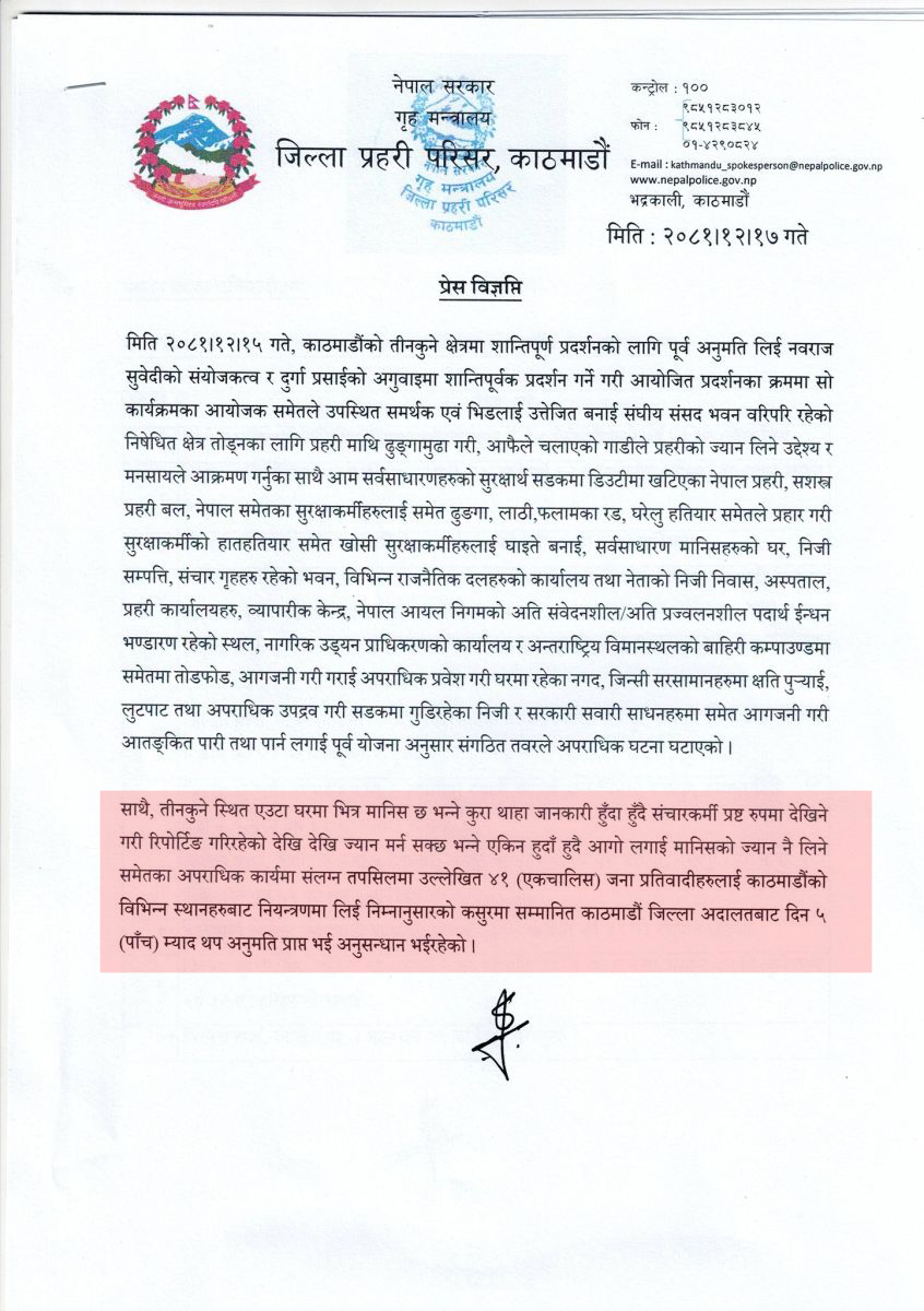 After obtaining a five-day custody extension from the Kathmandu District Court, the police started investigating the arrested individuals. They face investigations on charges of organized crime, arson, looting, and attempted murder.