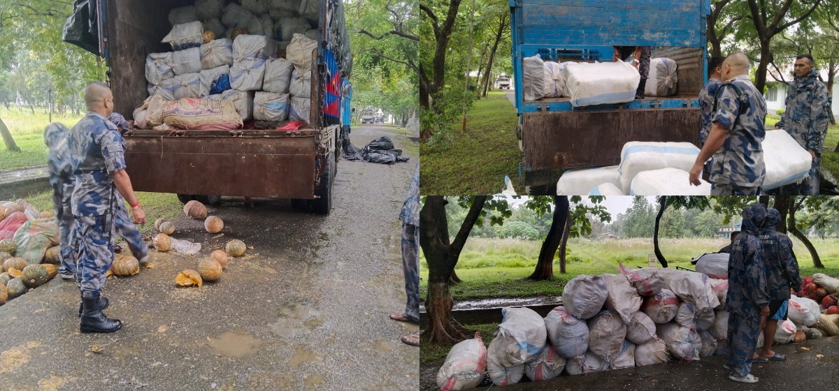Based on a tip-off, a Koshi Province APF team from Pakali, Sunsari, intercepted two suspicious trucks at around 1:30 AM. A search revealed 158 sacks of cannabis packed inside the vehicles.