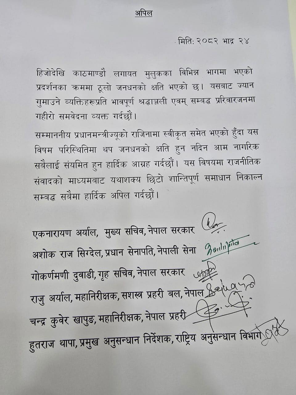 In a joint statement, Eknarayan Aryal, Chief Secretary of the Government of Nepal; Ashok Raj Sigdel, Chief of Army Staff; Gokarnmani Duwaadi, Home Secretary; Raju Aryal, Inspector General of the Armed Police Force; Chandra Kuver Khapung, Inspector General of Nepal Police; and Hutaraj Thapa, Chief Investigation Director of the National Investigation Department, expressed deep condolences for the at least 19 people who have died and extended sympathy to their families. Hundreds more have been injured during demonstrations in Kathmandu and other parts of the country.