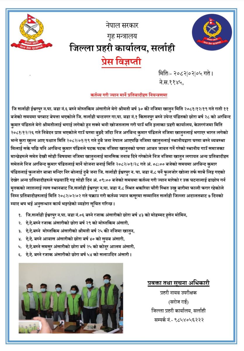 At a press conference held on Monday in Malangwa, Sarlahi, Police Chief SP Yogendra Kumar Khadka publicly named the suspects involved in the murder. The police reported that the murder took place on May 11.