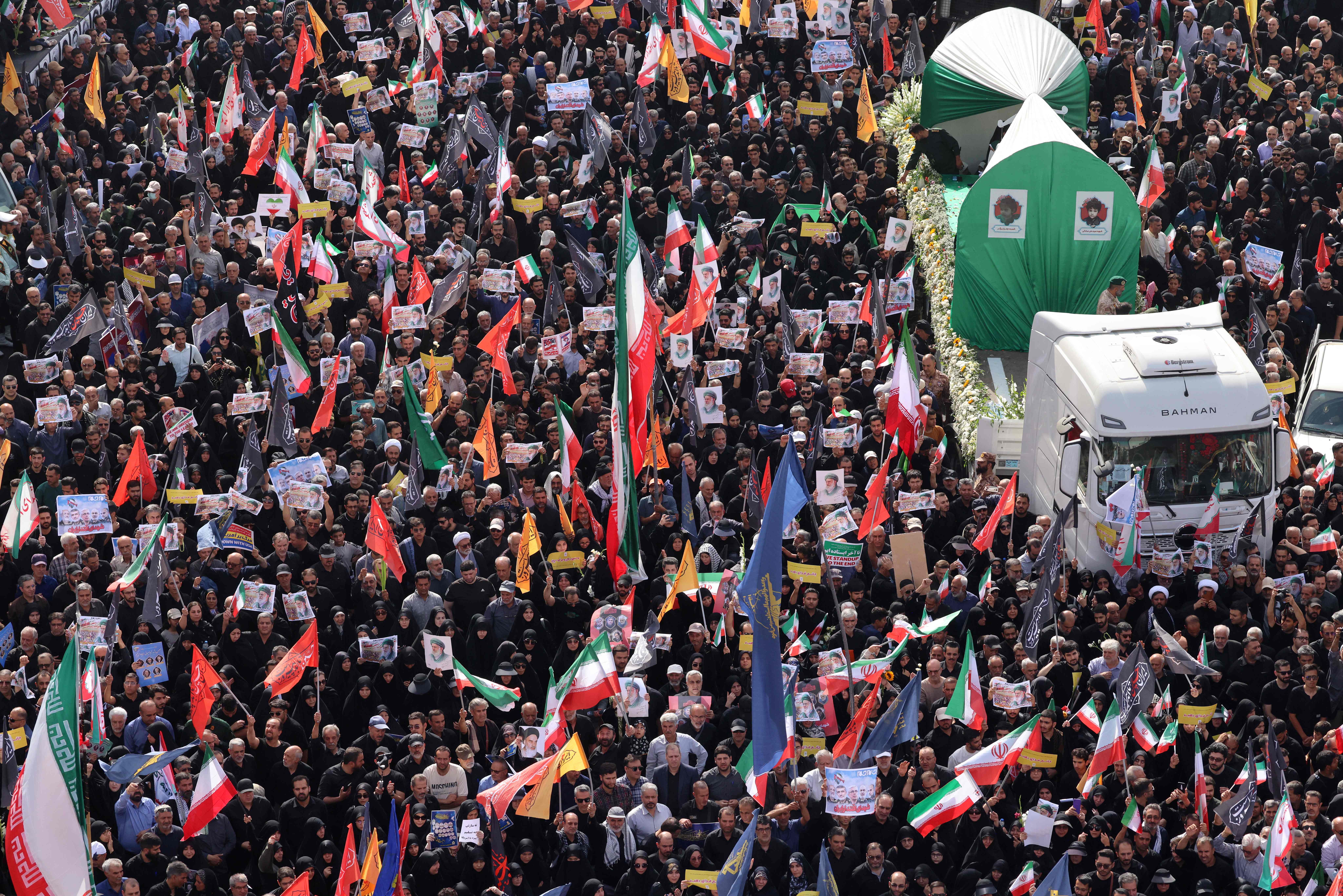 State television aired footage of thousands of black-clad mourners chanting "Death to America" and "Death to Israel" as they held aloft photographs of the dead.