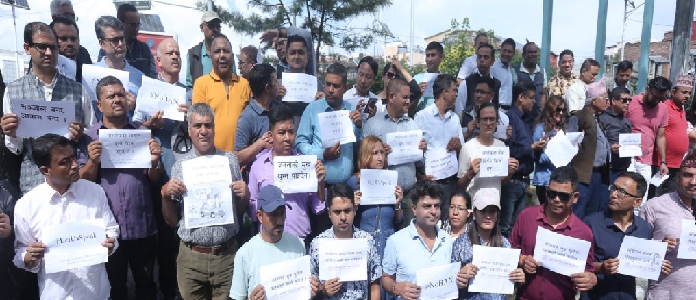 KATHMANDU, Sep 7: Scores of journalists gathered at Maitighar Mandala on Sunday to protest the government’s decision to ban social media.