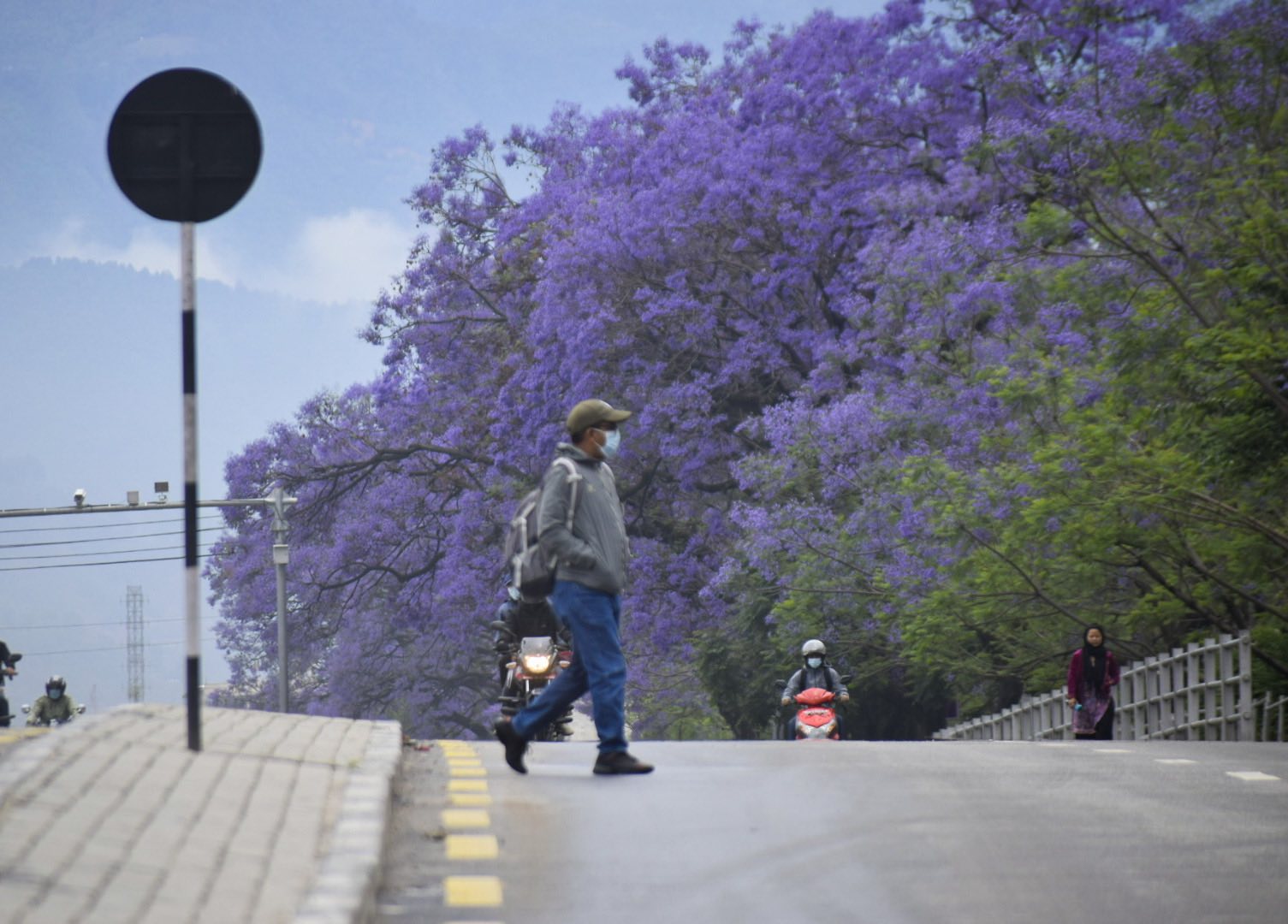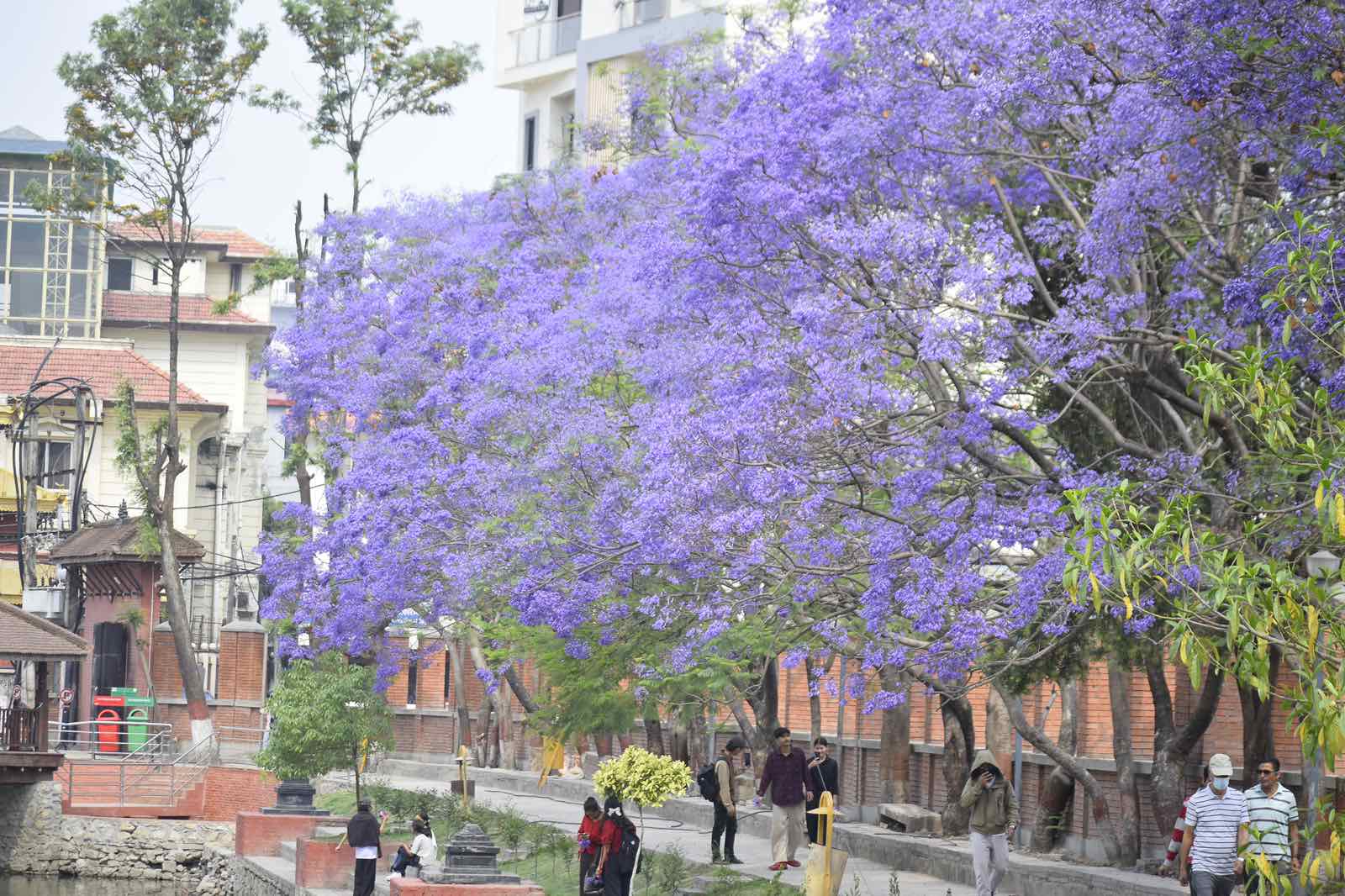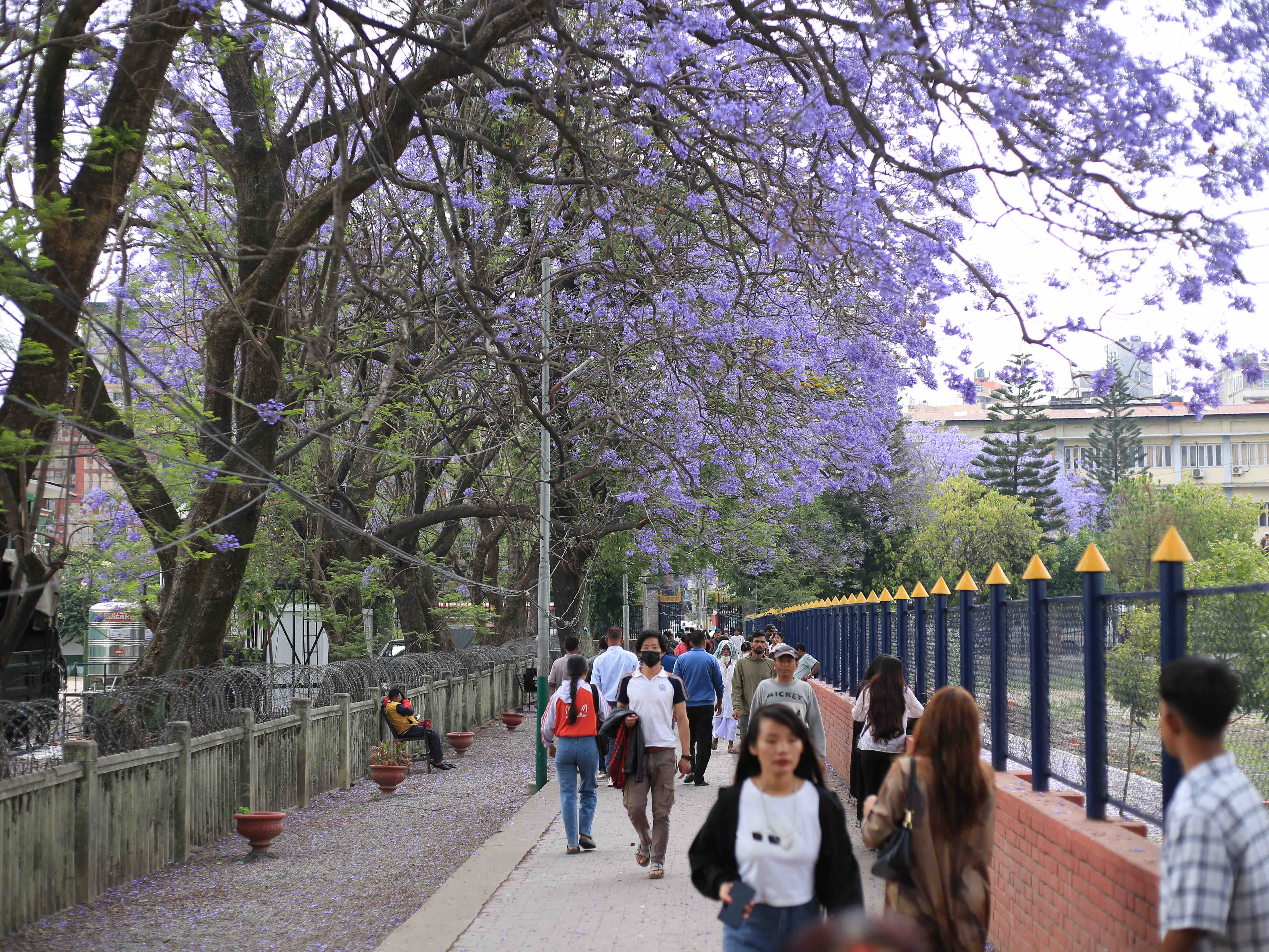 As the Nepali month of Baisakh begins, the city is now adorned with blooming jacaranda flowers along the roadsides, captivating locals and visitors alike. The vibrant flowers, along with the refreshing, pollution-free air, have made the city a picturesque haven this spring.