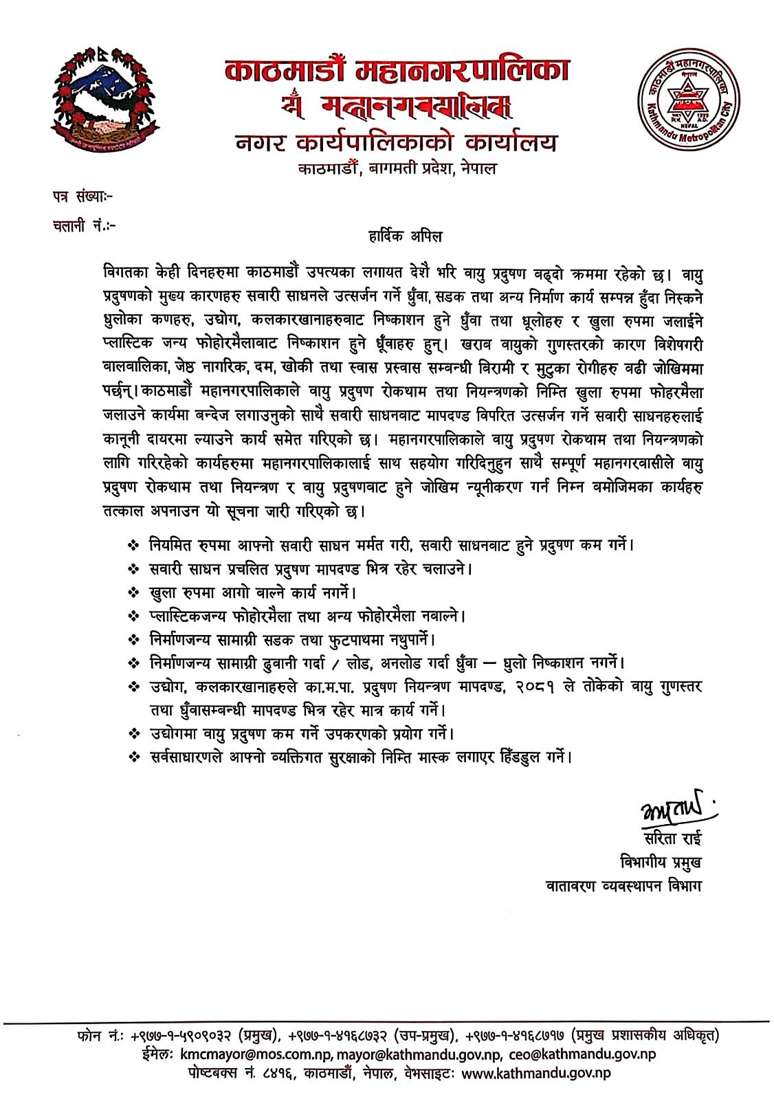 KATHMANDU, April 4: The Kathmandu Metropolitan City (KMC) has recently stated that air pollution is increasing in the Kathmandu Valley and across the country, urging the public to cooperate in reducing the risks. On Friday, the KMC issued a nine-point appeal to the general public.