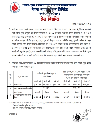 Similarly, it has reduced aviation fuel prices. It lowered the price by Rs 7 per liter for domestic flights, while for international flights from Kathmandu, it cut the cost by USD 51 per kiloliter.