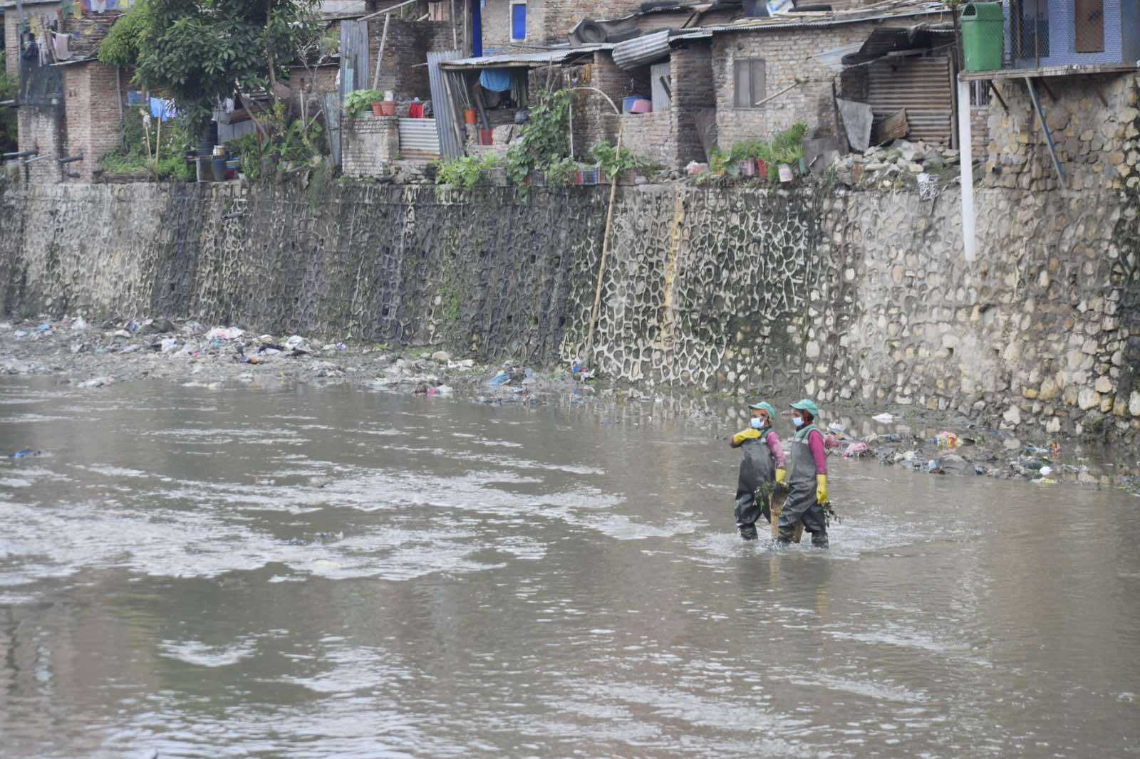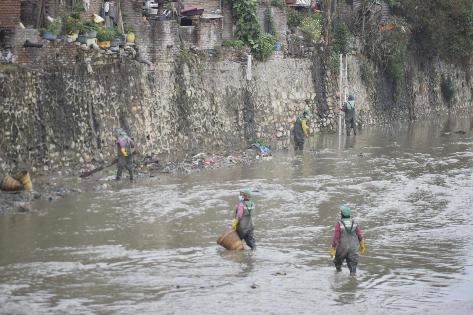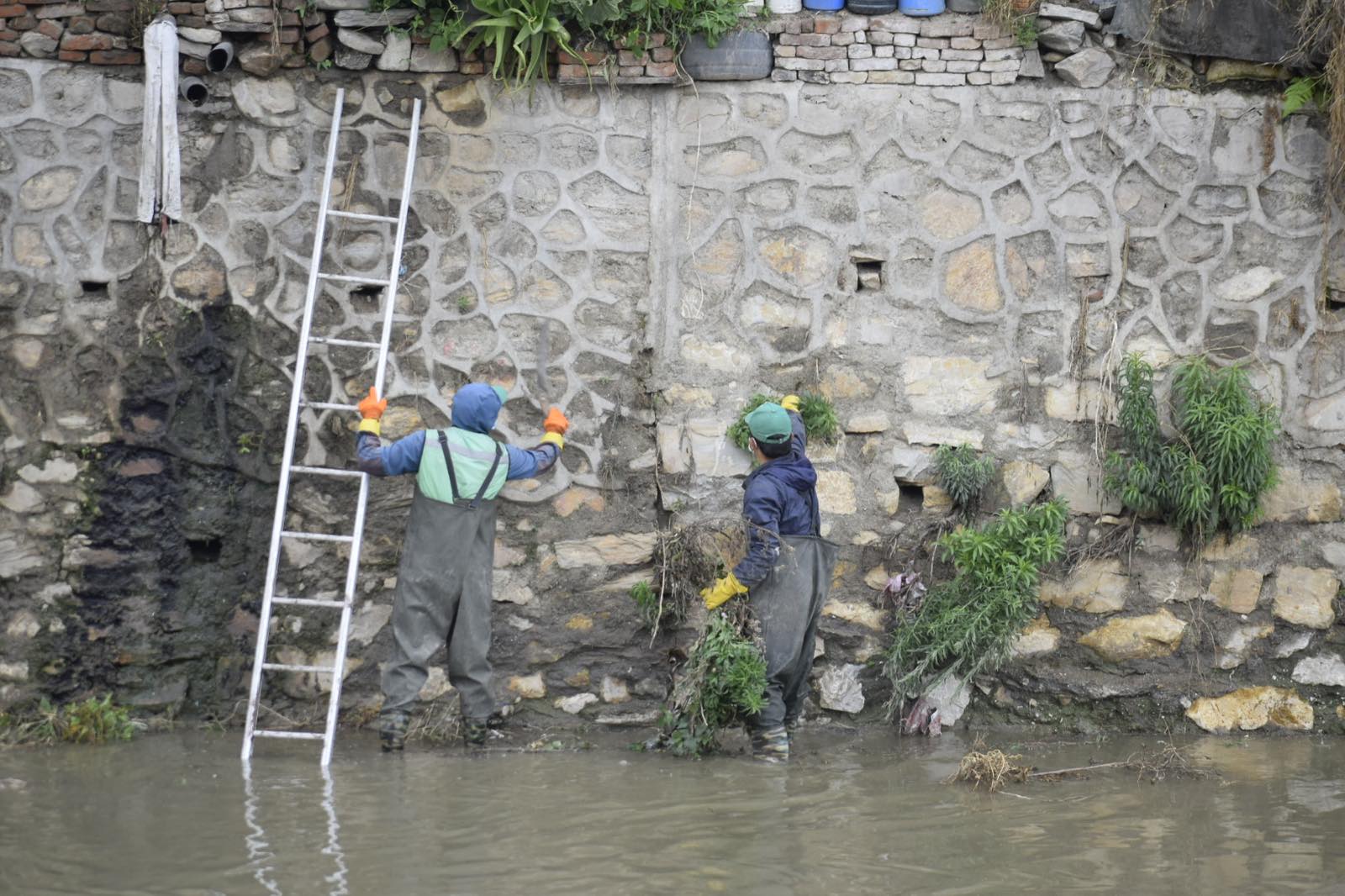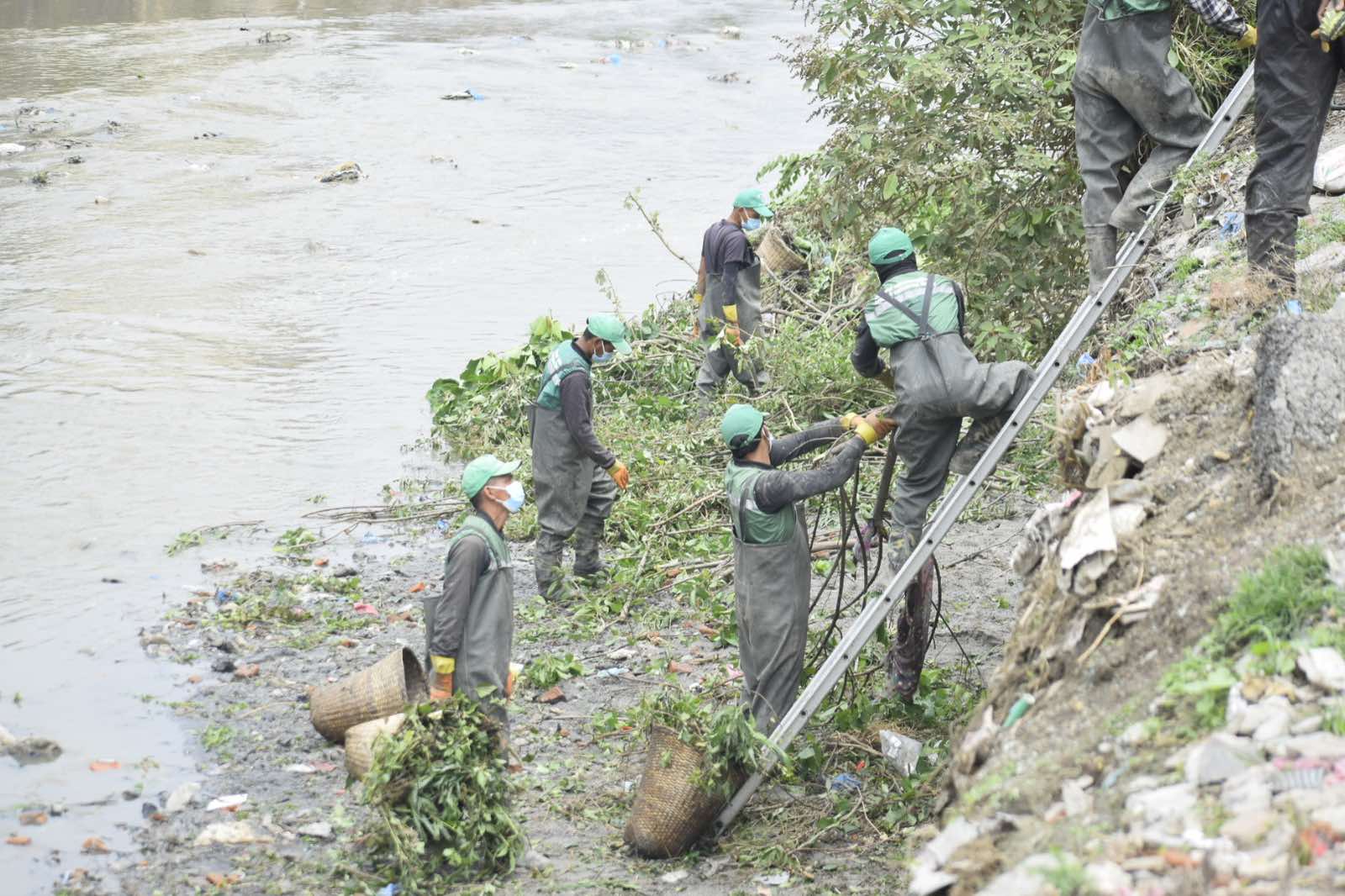 Under the leadership of the metropolis' Environment Management Department, workers affiliated with the Labor Bank of Kathmandu Metropolitan City have stepped directly into the river to remove waste, overgrown weeds, fallen trees and other debris obstructing the water flow.