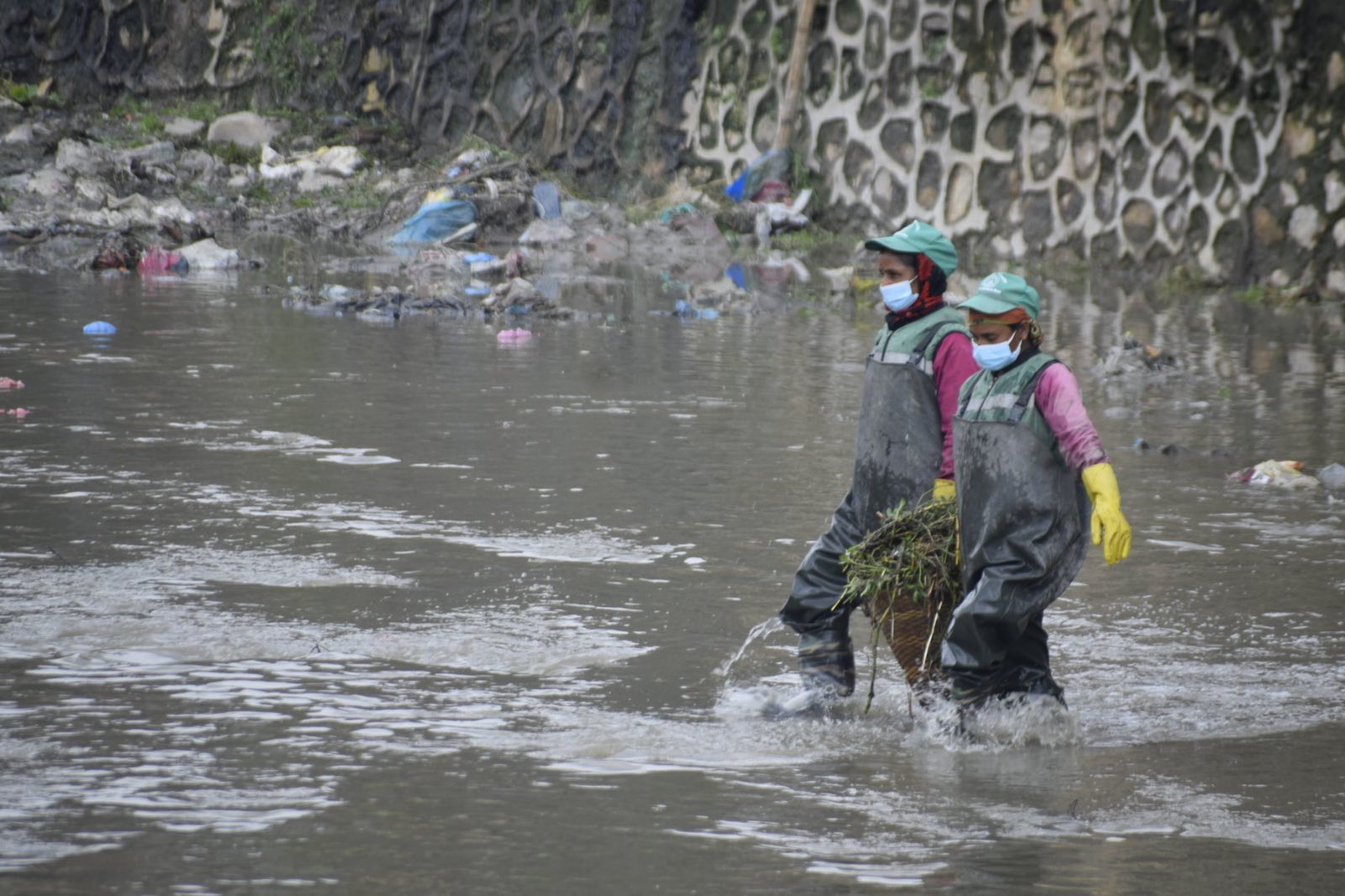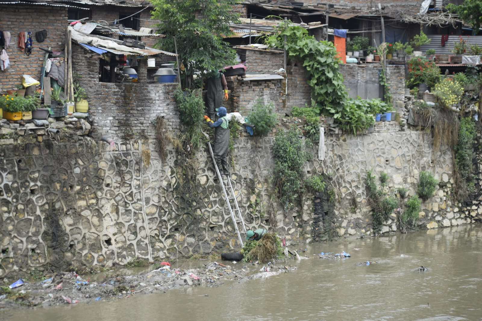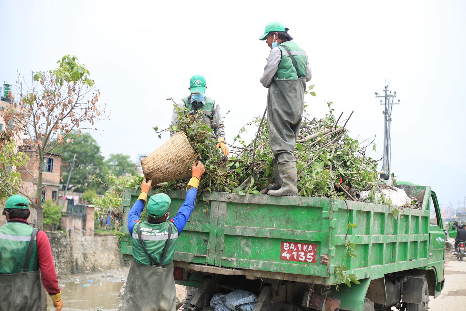 Under the leadership of the metropolis' Environment Management Department, workers affiliated with the Labor Bank of Kathmandu Metropolitan City have stepped directly into the river to remove waste, overgrown weeds, fallen trees and other debris obstructing the water flow.
