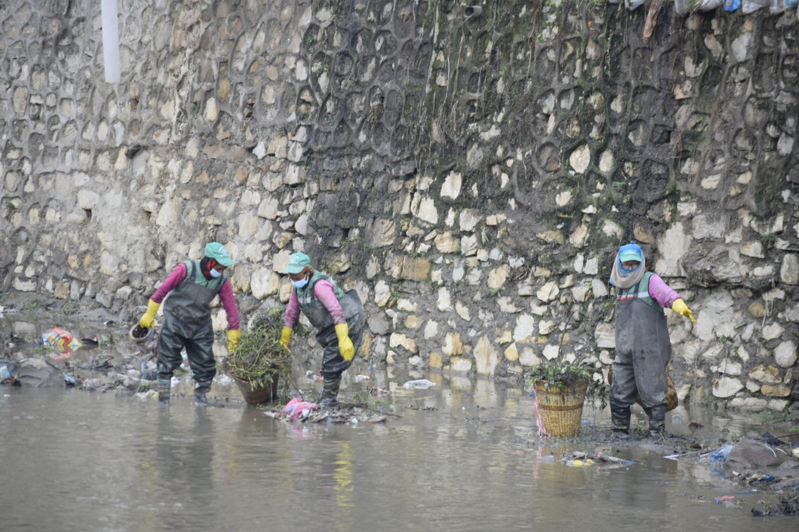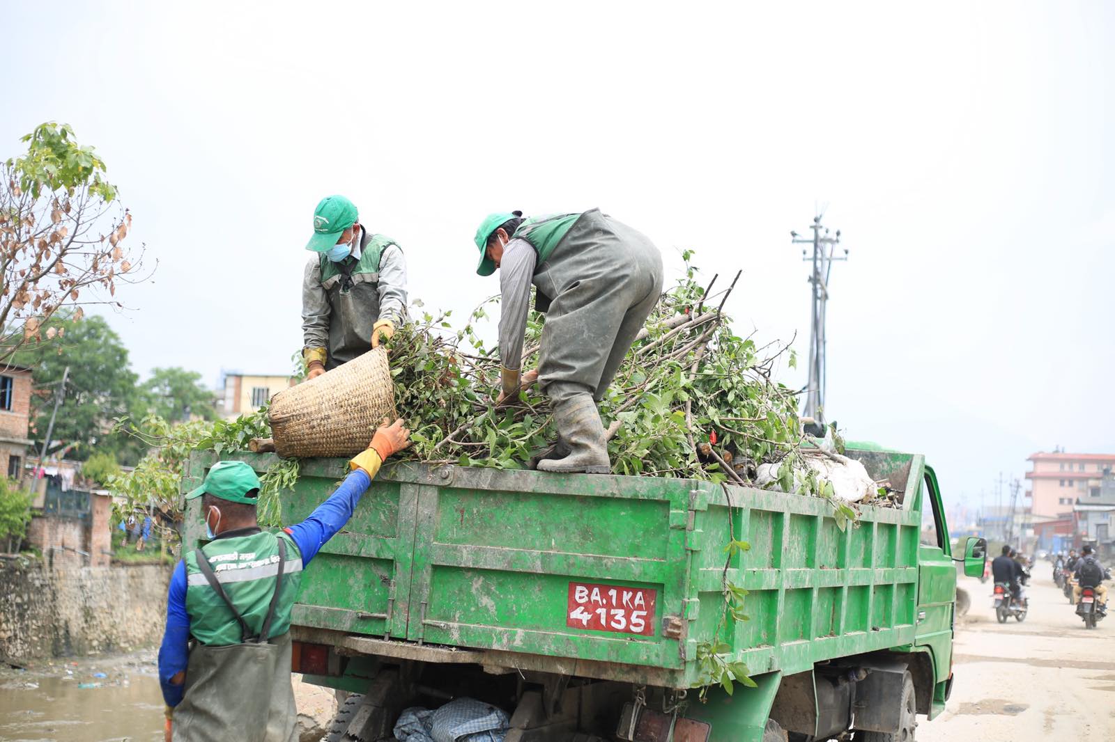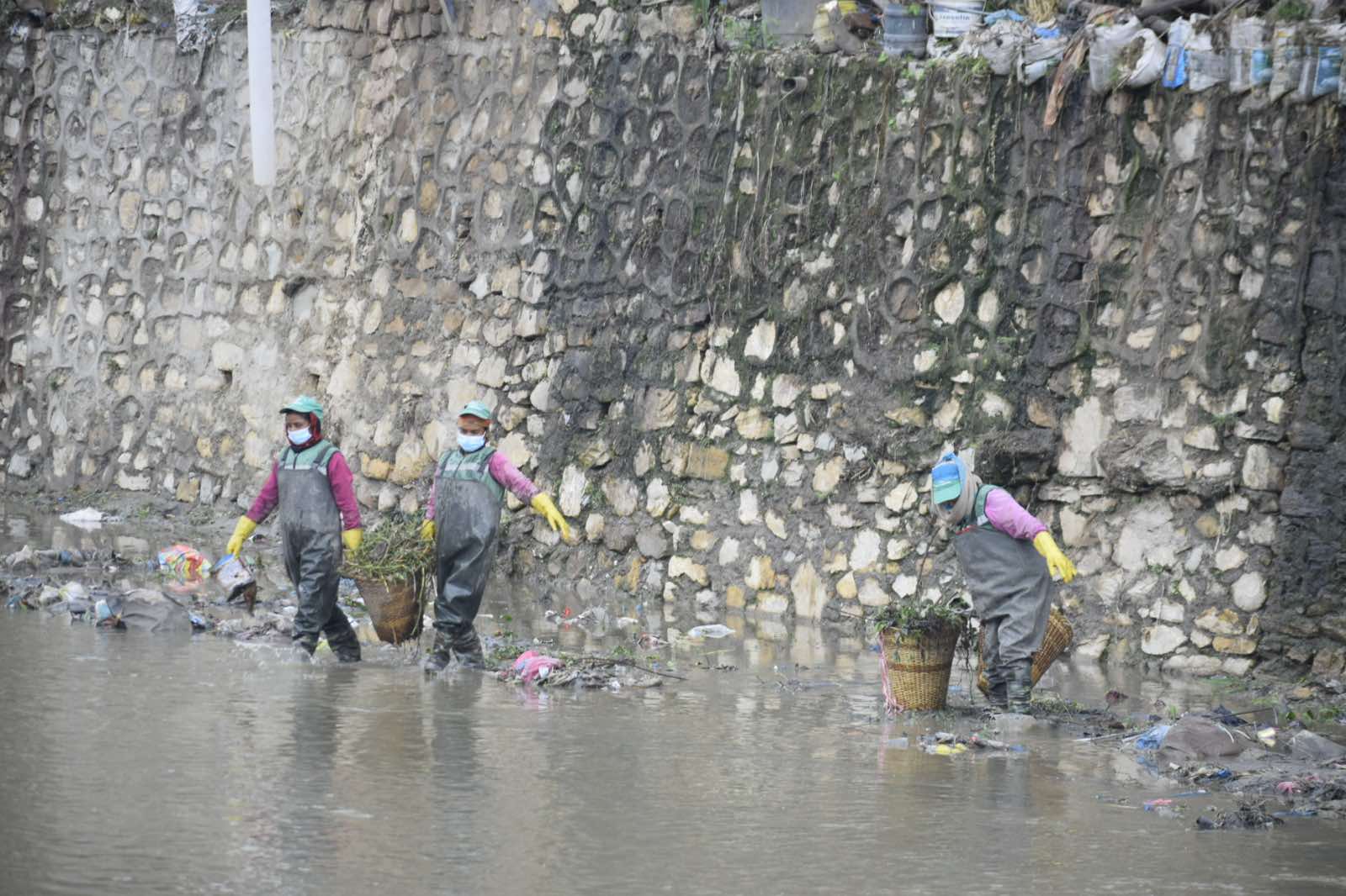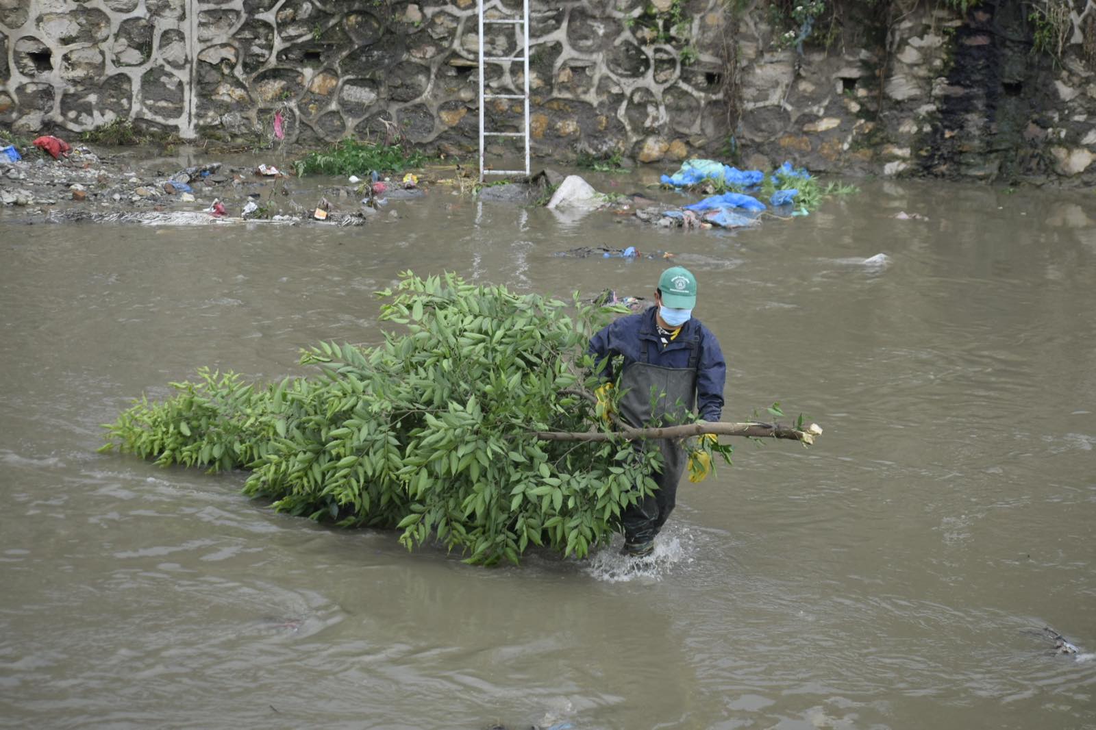Under the leadership of the metropolis' Environment Management Department, workers affiliated with the Labor Bank of Kathmandu Metropolitan City have stepped directly into the river to remove waste, overgrown weeds, fallen trees and other debris obstructing the water flow.