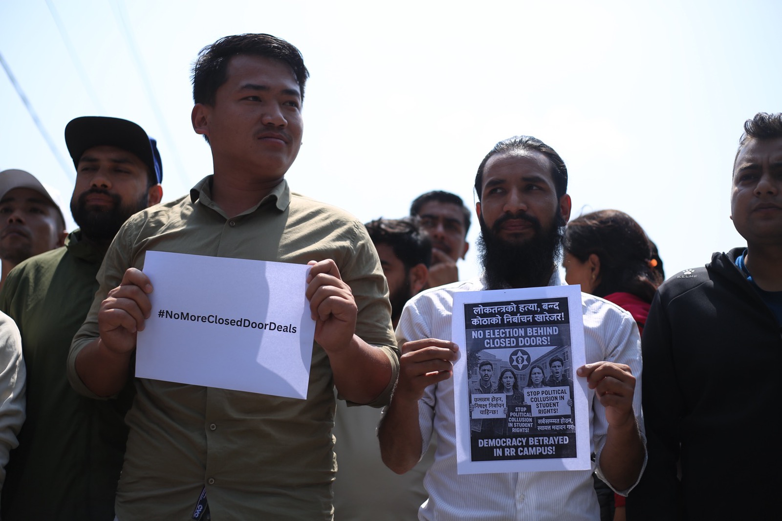 Placards bearing messages such as ‘No Election Behind Closed Doors’ ‘Democracy Betrayed in RR Campus’ ‘We Demand Fair and Free Elections’ were prominently displayed during the protest.