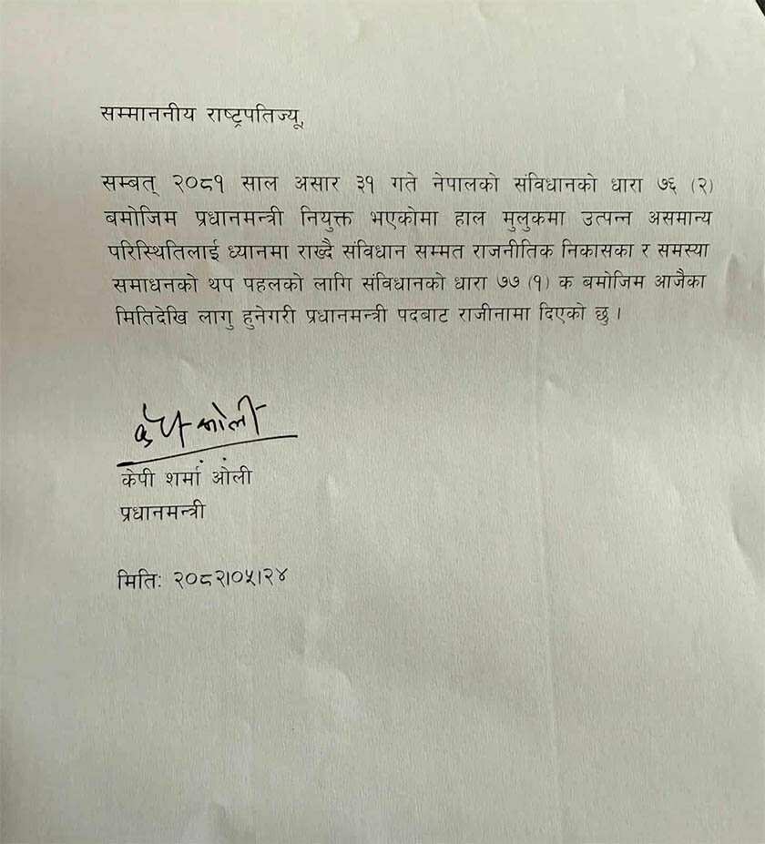 He submitted his resignation to President Ram Chandra Paudel in accordance with Article 76(2) of the Constitution of Nepal. In his resignation letter, Prime Minister Oli stated that he submitted his resignation to pave the way for the nation considering the ongoing difficult situation in the country. His resignation will take effect today as per the constitutional provision of Article 77(1).