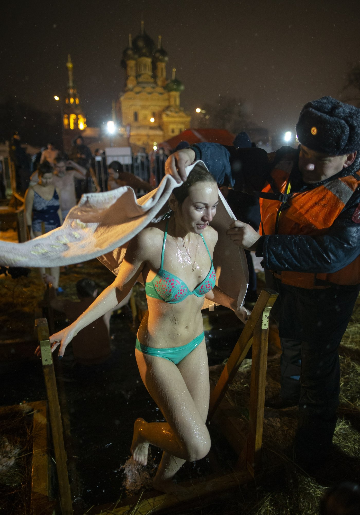 Across Russia, the devout and the daring are observing the Orthodox Christian feast day of Epiphany by immersing themselves in frigid water through holes cut through the ice of lakes and rivers.