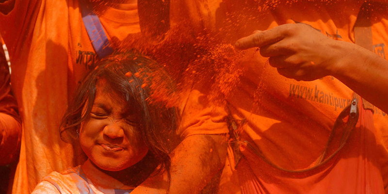 As a part of the celebrations, people carry chariots of Hindu gods and goddesses and smear red vermilion powder onto each other.