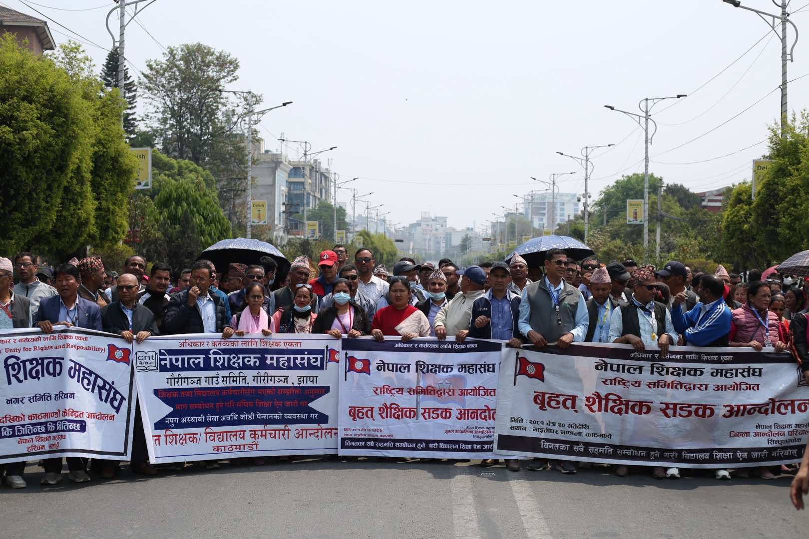 KATHMANDU, April 6: The National Committee of the Nepal Teachers' Association (NTA) organized a large rally and protest march from Maitighar Mandala to New Baneshwor on Sunday, demanding the issuance of a new Education Act that addresses all past agreements made with it.