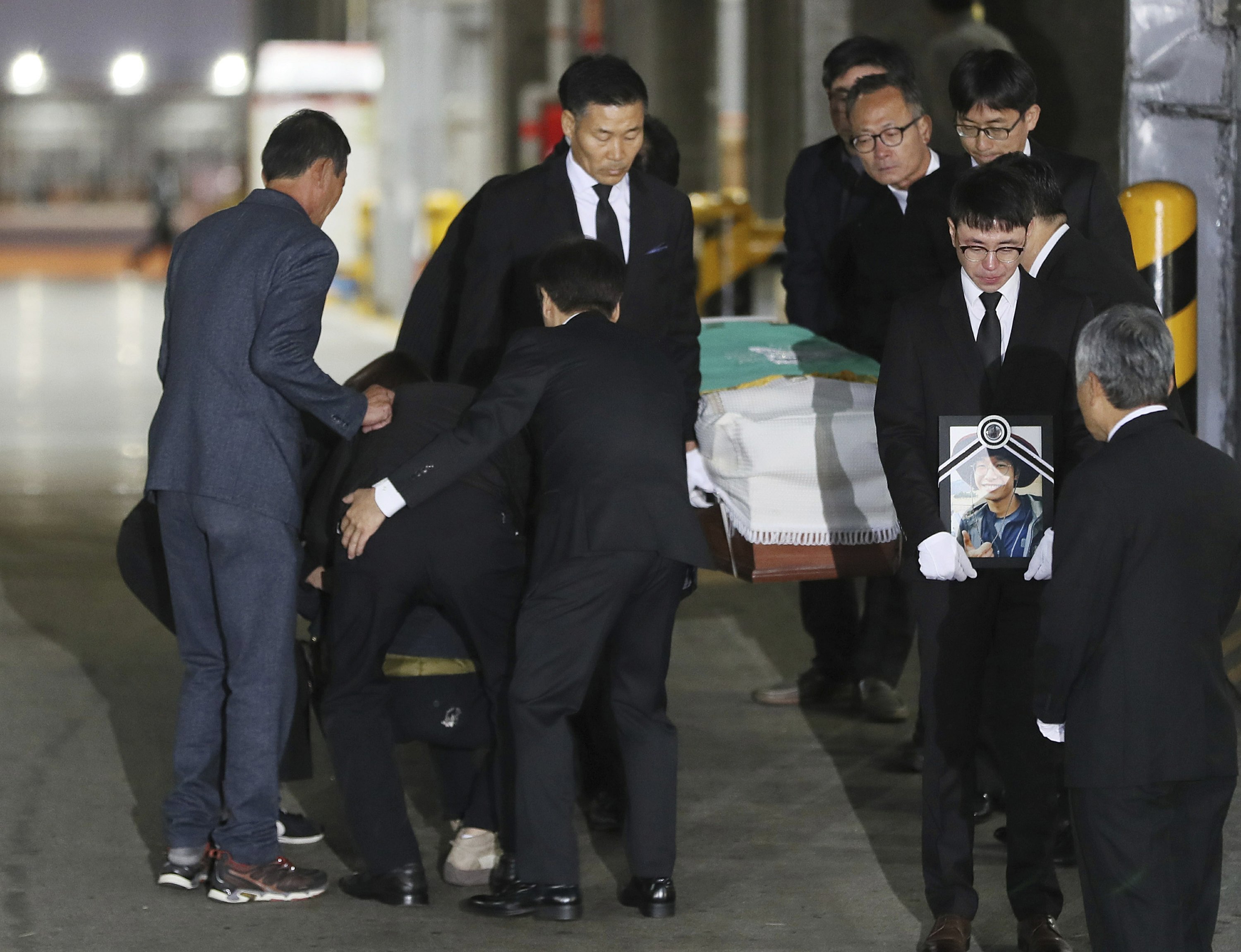 The caskets covered in white sheets were carried out from a terminal in Incheon International Airport before being loaded on vehicles headed to funeral homes in Seoul, Uijeongbu and Busan.